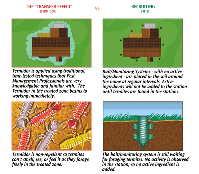 RECRUITING CAN TAKE YEARS TO CONTROL A COLONY. Many termite bait/monitoring systems work by recruitment, which means termites eat the bait and return to the colony to recruit others to eat the bait. However, this process cannot begin until activity is identified in a monitoring station. Bait/ monitoring systems can take months to years to control a colony. Termidor provides 100% control in three months or less. To learn more about how Termidor compares to bait/monitoring systems - some of which use recruitment to control termites - consult the easy-to-follow pictorial guide below.